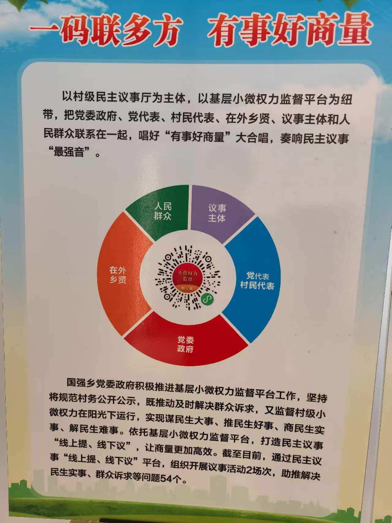 在村部党群活动中心,林同池一行查看了办公环境,详细了解了国强乡结合本地实际创新的“五事工作机制”基层治理模式。他对该模式及其宣传推广工作给予充分肯定,指出“线上提、线下议”流程图清晰直观、便于操作,“二维码”一码联通、便利监督,民主议事机制立足实际、讲求实效,有力提升了基层治理效能。